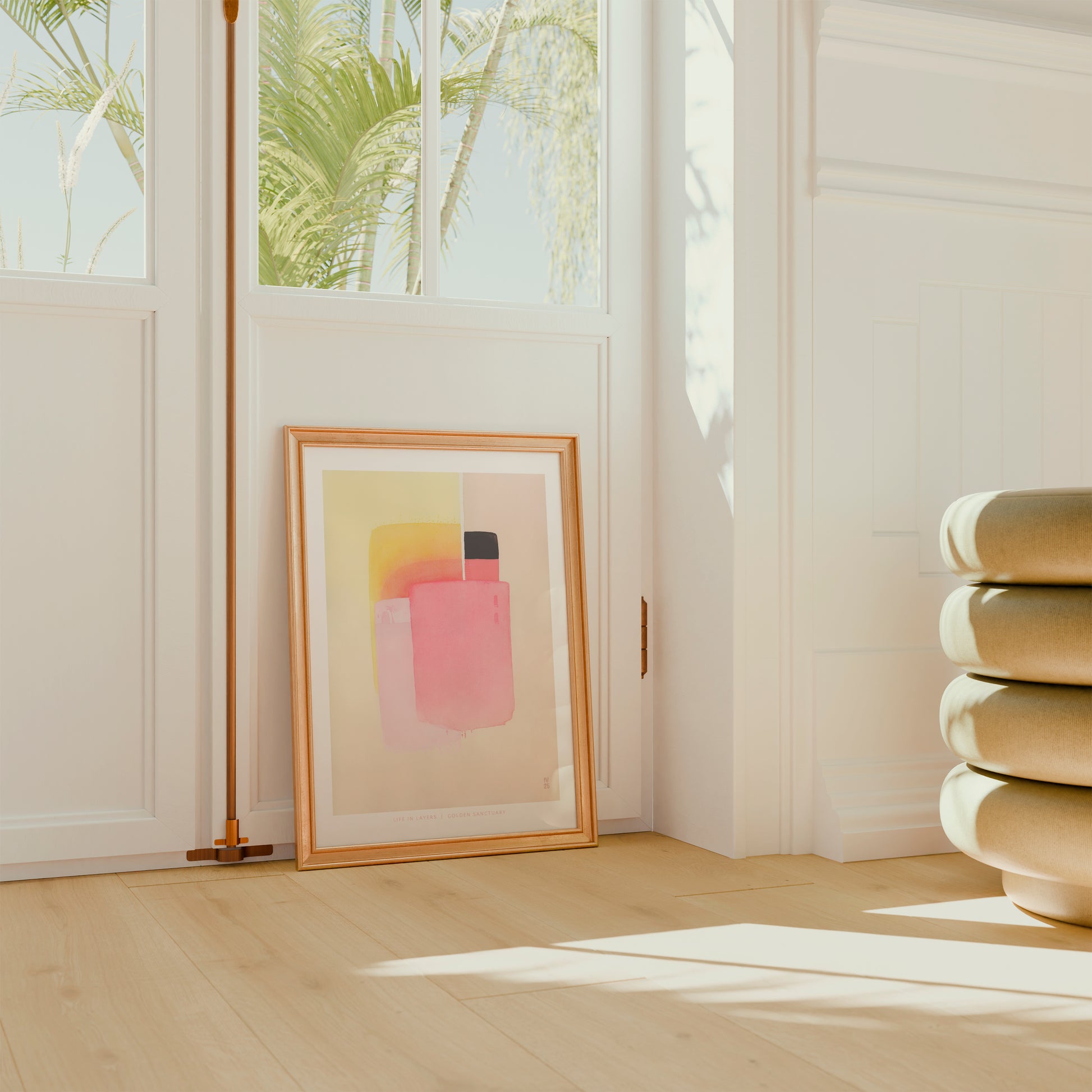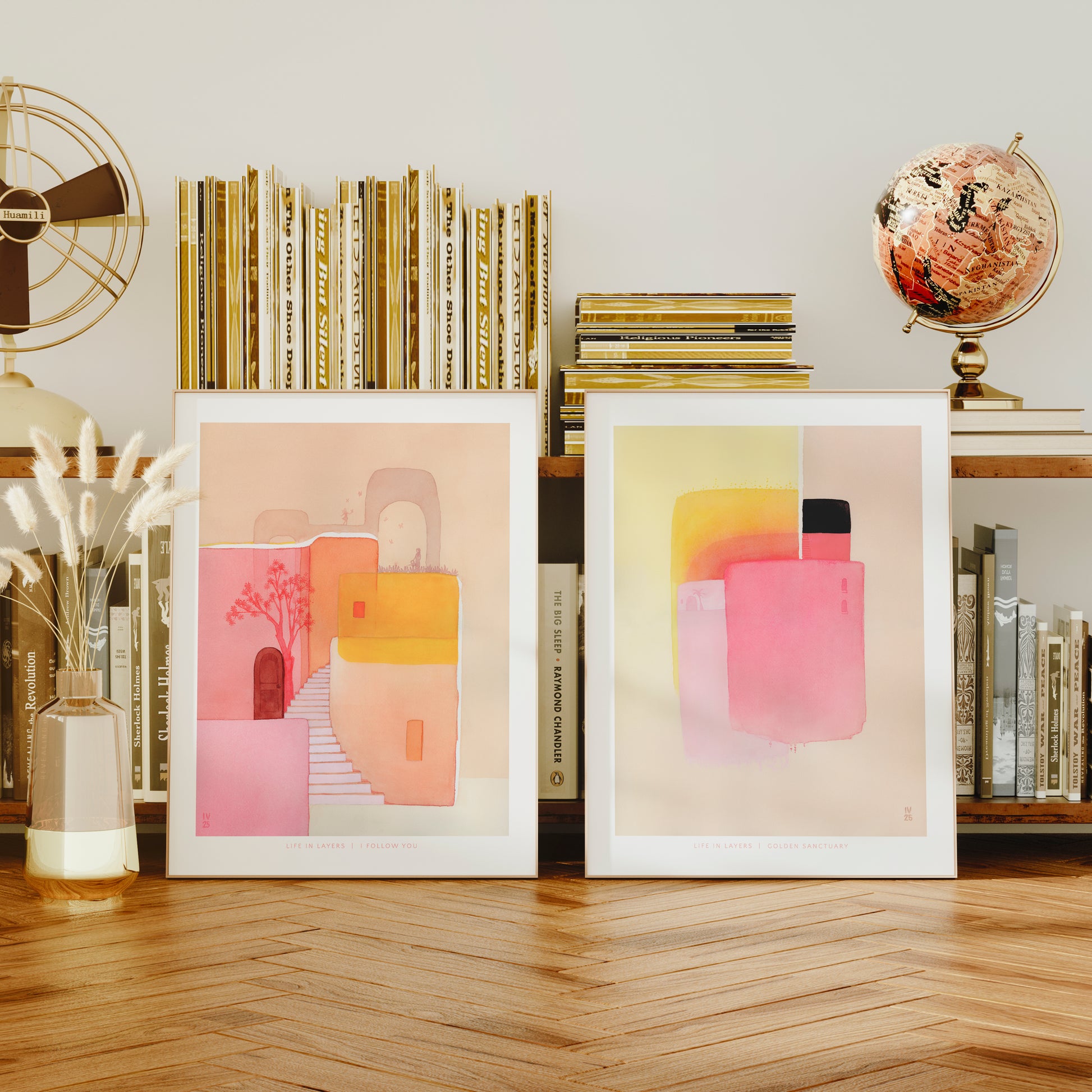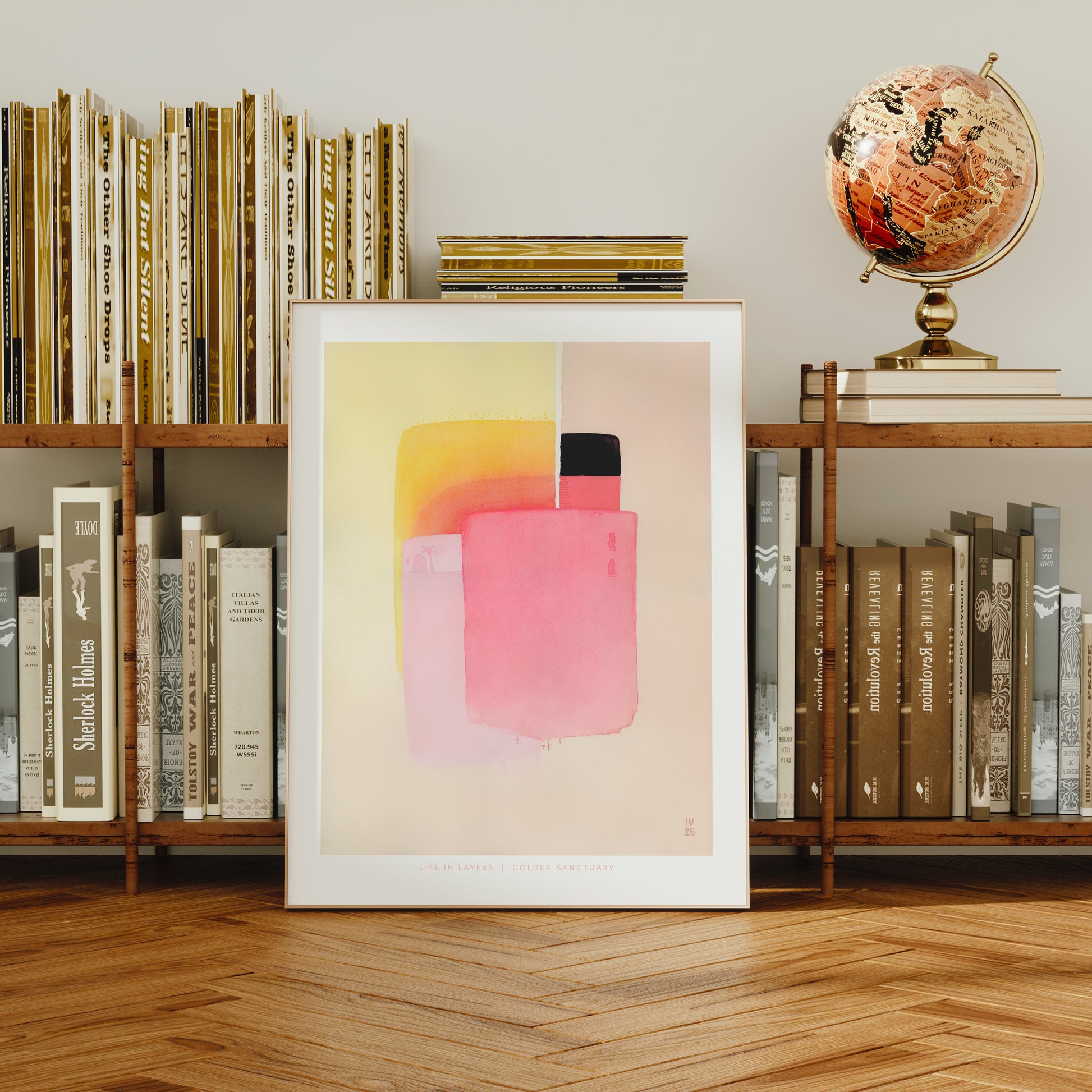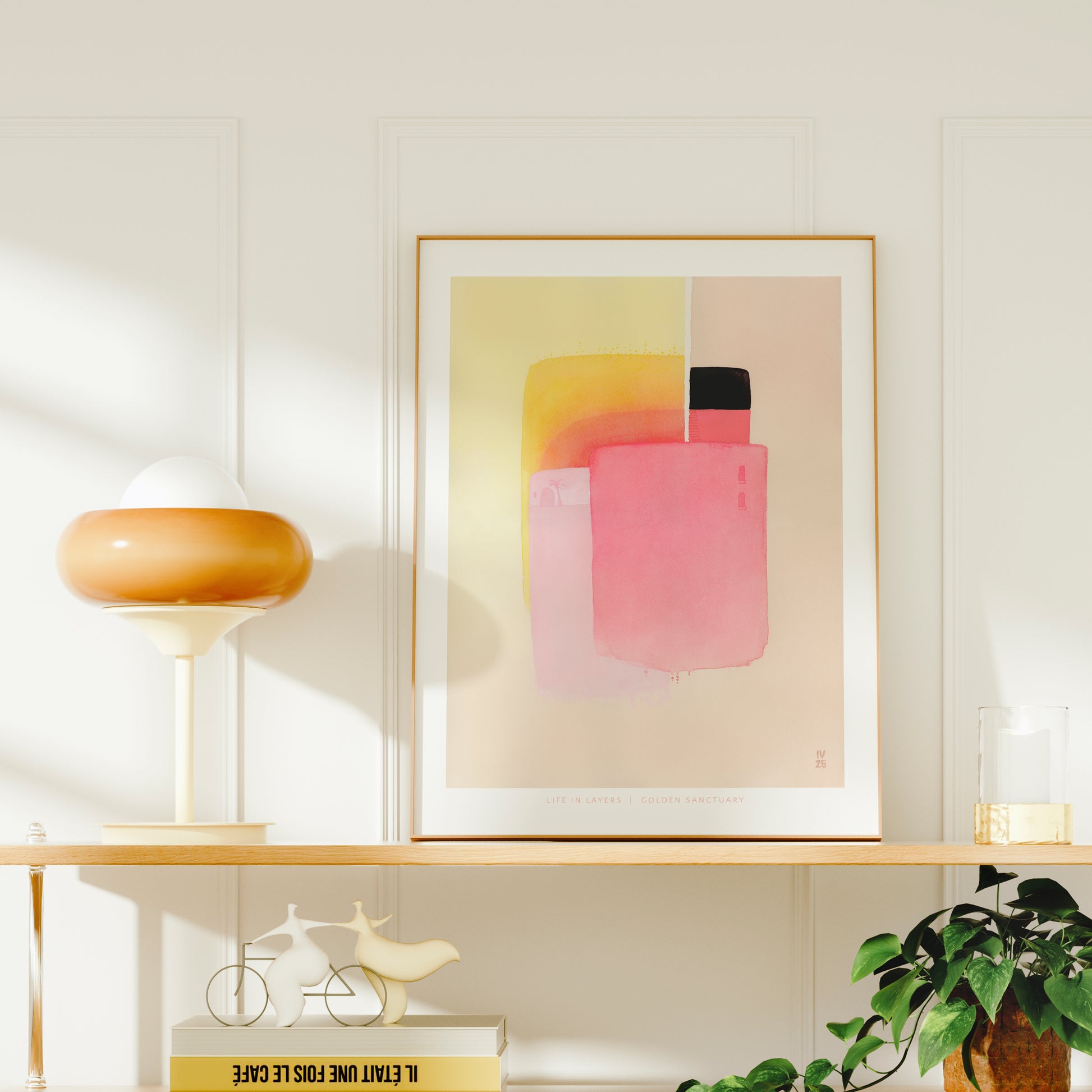 Floating on coral and rose, one side holds light, the other side a corner of darkness in this sacred abstract landscape. A mystical dance of contrasts, where a sanctuary of warm golden light is always waiting to embrace us, as we step out of the shadows.